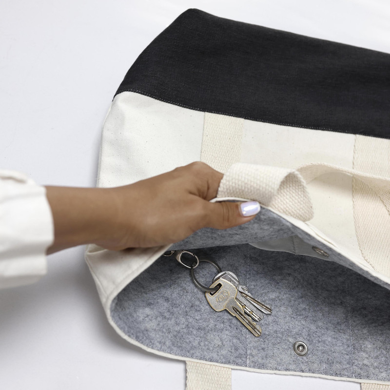 کیف دارای یک جیب کلی و دوجیب مجزا در داخل و یک جیب جای موبایل بر روی کیف هست.کیف سه جیب آستر از جنس نمد دارد که باعث ایستایی بالای کیف میباشد. کیف از جنس کتان پنبه صد در صد هست و دوستدار محیط زیست. بسیار سبک و جادار هست.